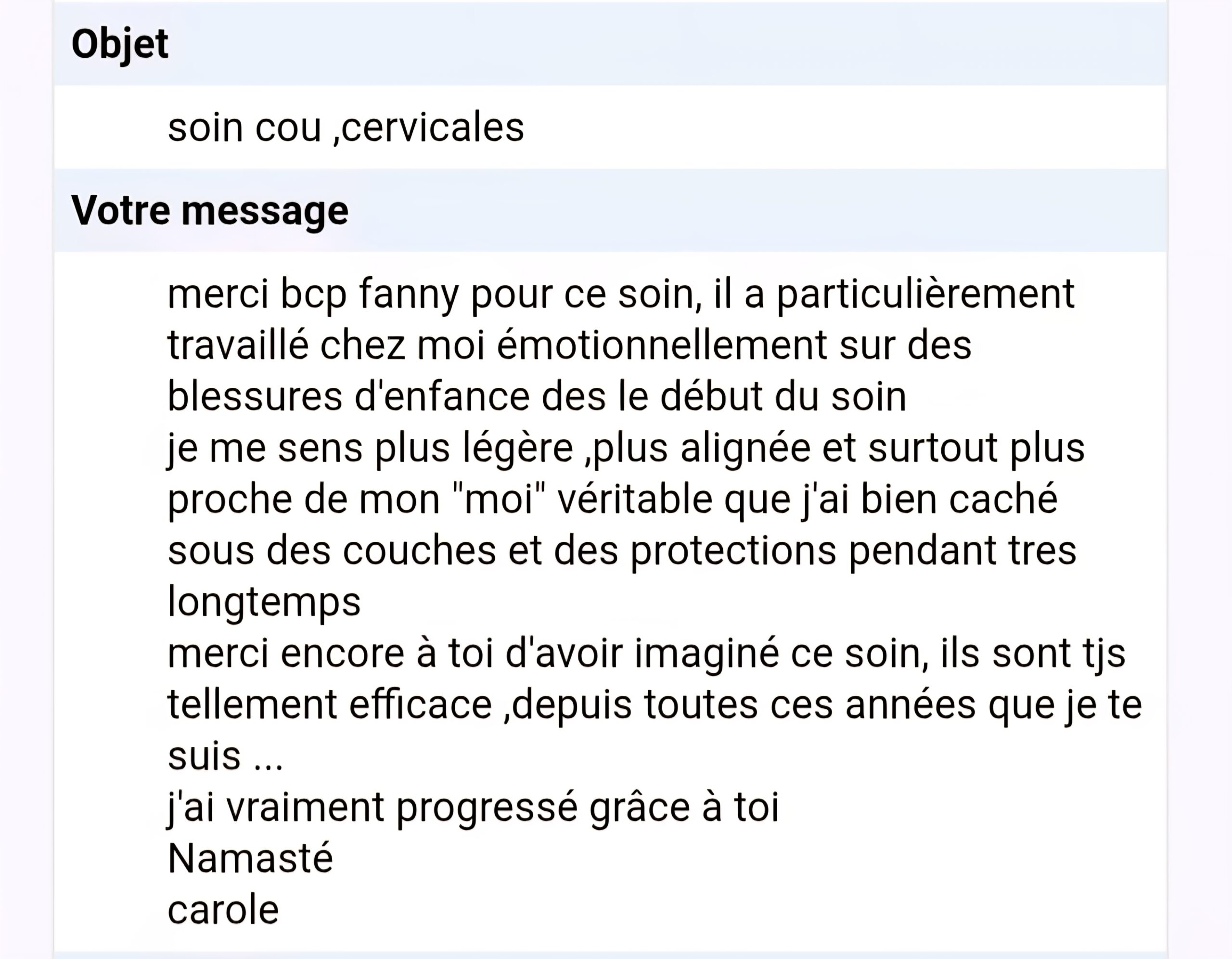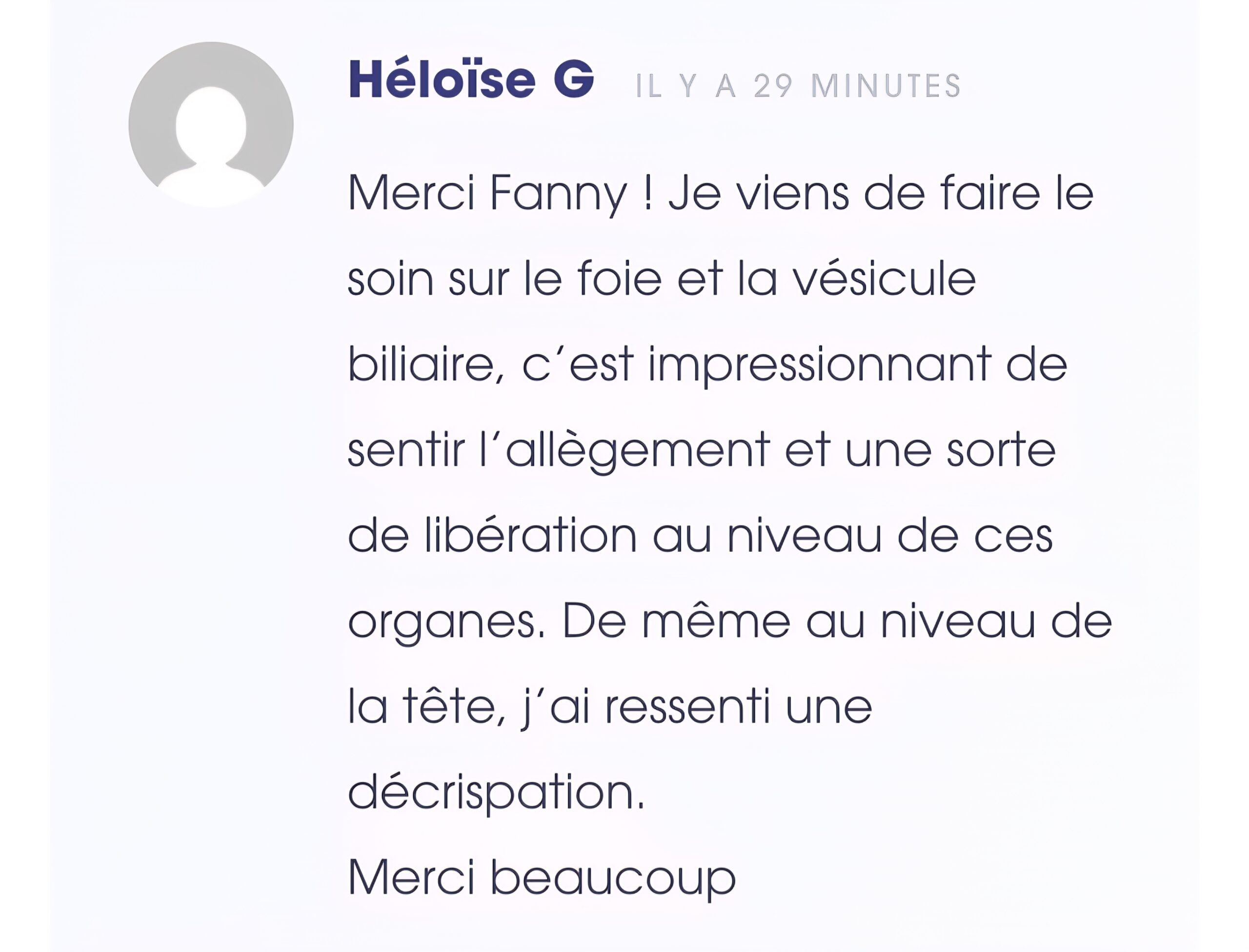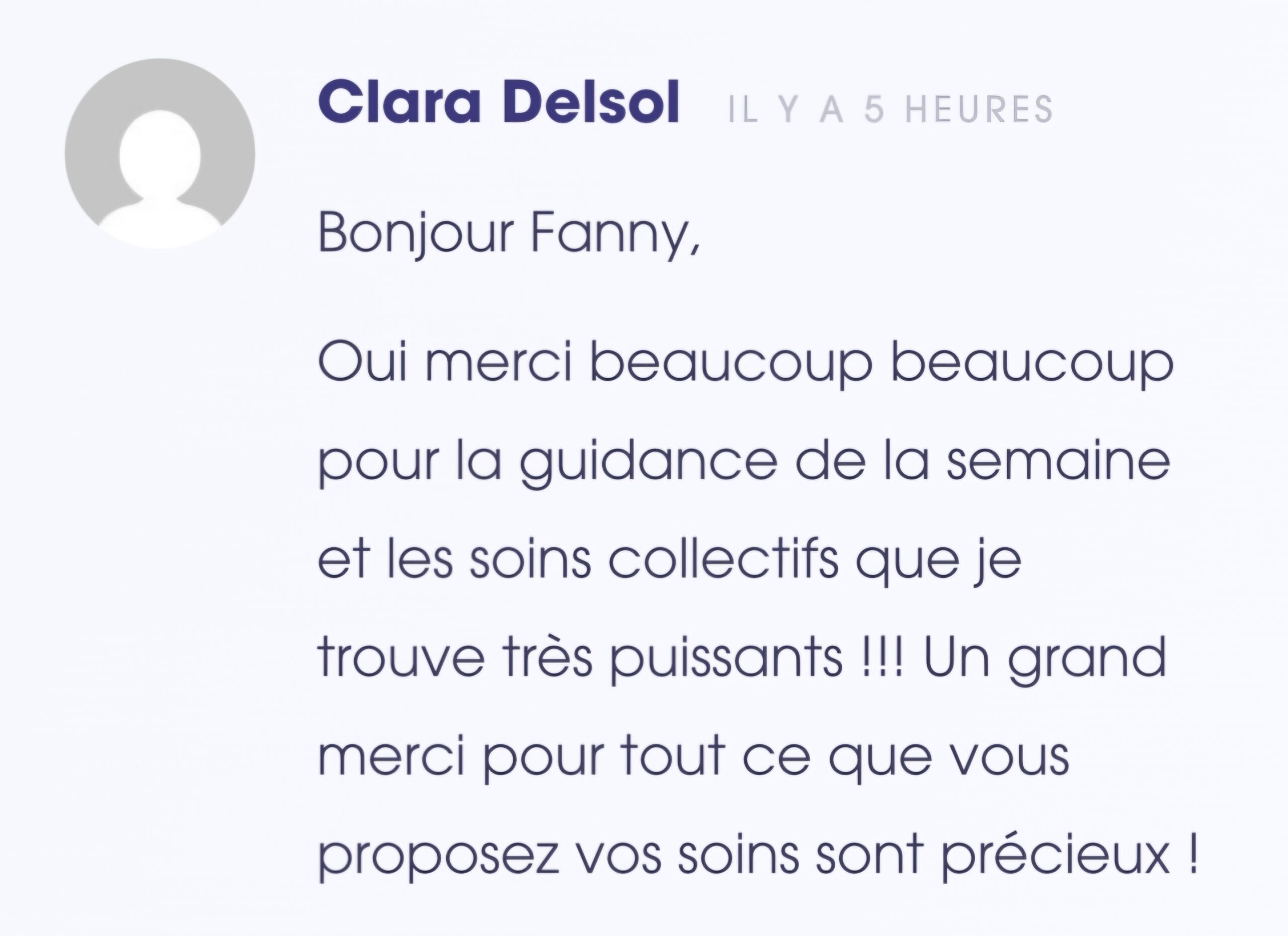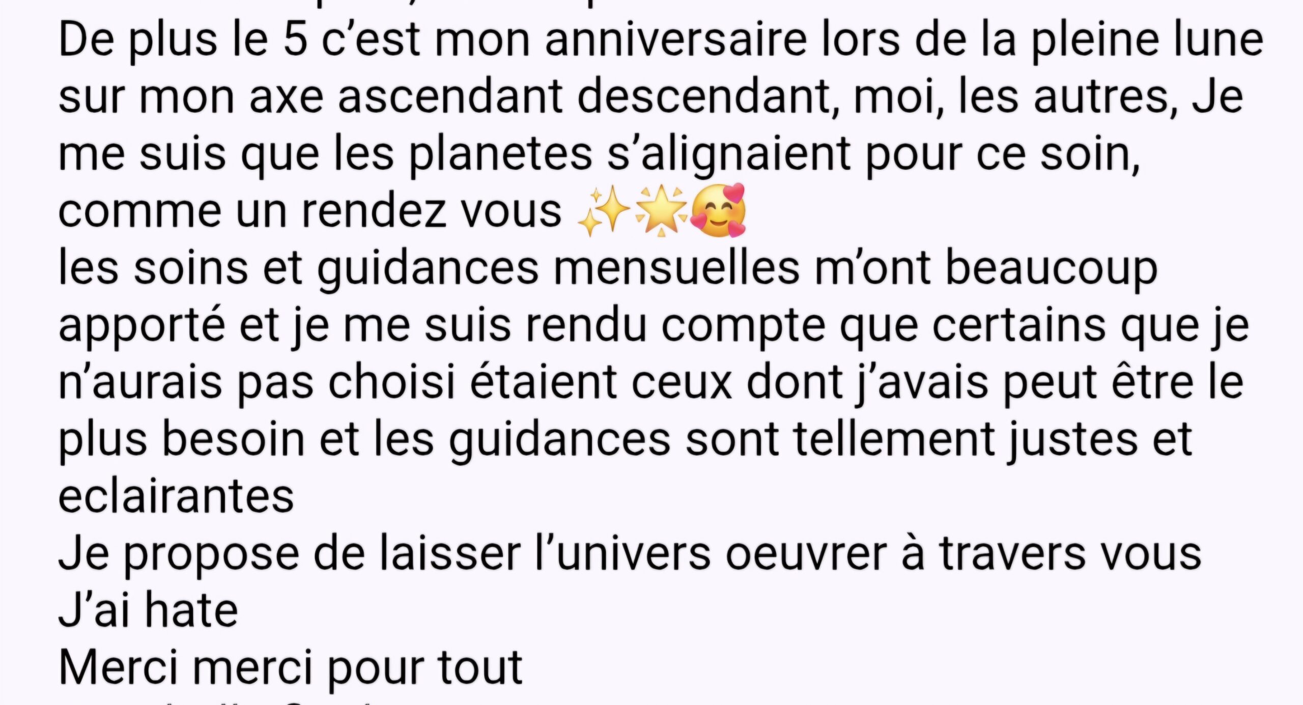 Voici quelques témoignages et avis reçus suite à des soins collectifs, des soins individuels ou des guidances, depuis le début de mon activité d’énergéticienne en 2013.